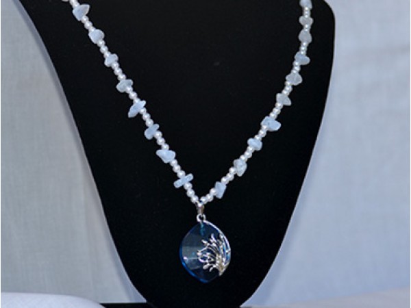 This handmade pendant style necklace is made with Blue Lace Agate chips and synthetic pearls and has a beautiful glass and silver metal main stone in a soft blue as the focal point. The necklace is 20 inches in length and features a barrel clasp closure. Made in the United States, this unique piece of fashion jewelry will make it a stylish accessory for any outfit.